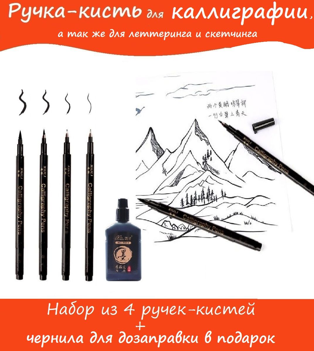 Набор из 4 ручек (линеров) кистей и чернил для дозаправки предназначен для начинающих и профессиональных художников. Ручки кисти (линеры кисти) на основе пигментных чернил отлично подходят для леттеринга, каллиграфии и скетчинга. Чернила лайнеров водостойкие, без кислотные, светостойкие, не содержат ксилен. В наборе 4 ручки кисти с размерами: большая и тонкая кисть.